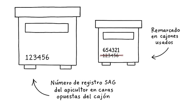 Cada colmena deberá estar marcada con el número de registro SAG del apicultor, de forma visible e indeleble. Es como el “RUT” de cada colmena, una forma de asegurar trazabilidad y propiedad.
